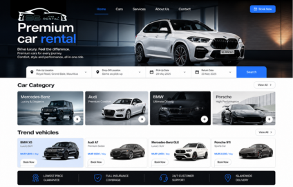 A premium car rental concept with luxury visuals, responsive layout, strong booking structure and modern UI cards.
